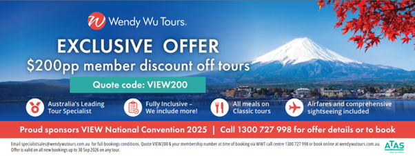 Wendy Wu Tours partnered with VEIW Clubs to sponsor our 2025 National Convention in Brisbane and is offering a great deal to all VIEW members.